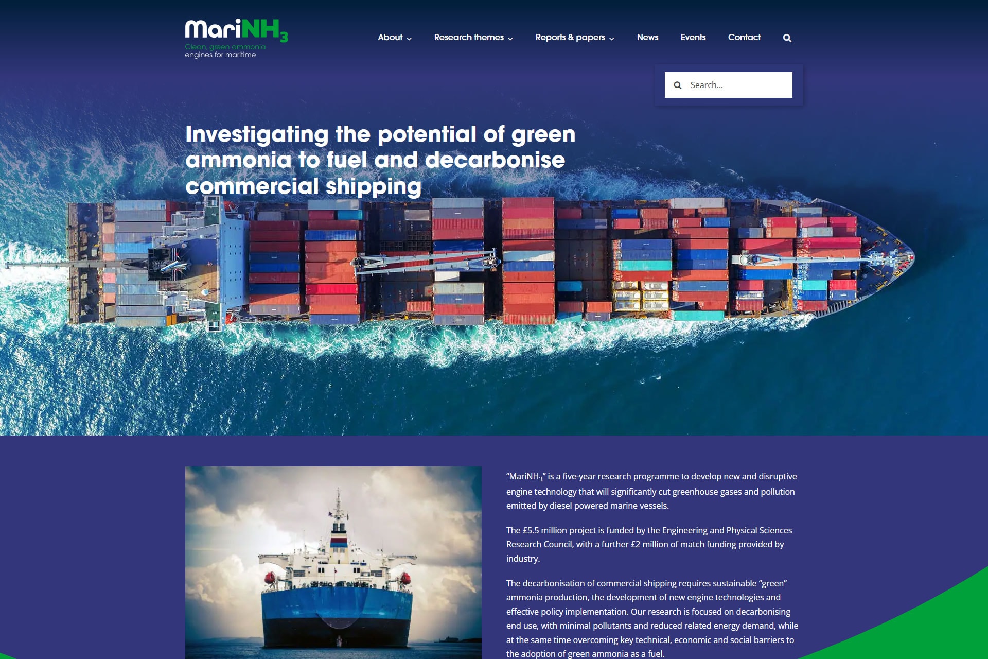 Engine Room2025-03-19T16:58:31+00:00Website for MariNH3, a five-year research programme to develop new and disruptive engine technology that will significantly cut greenhouse gases and pollution emitted by diesel powered marine vessels.